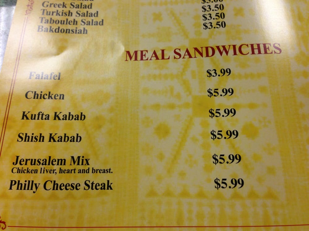 Sliced beef, melted cheese, sauteed onions, and bell peppers stuffed in pita bread.
